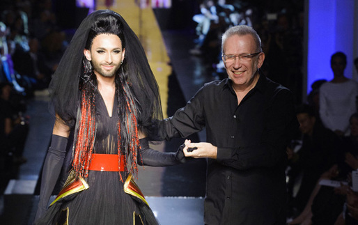 Jean Paul Gaultier ao lado de Conchita Wurst no encerramento do último desfile da grife, na temporada Inverno 2015 Alta-Costura (Foto: Reprodução)
