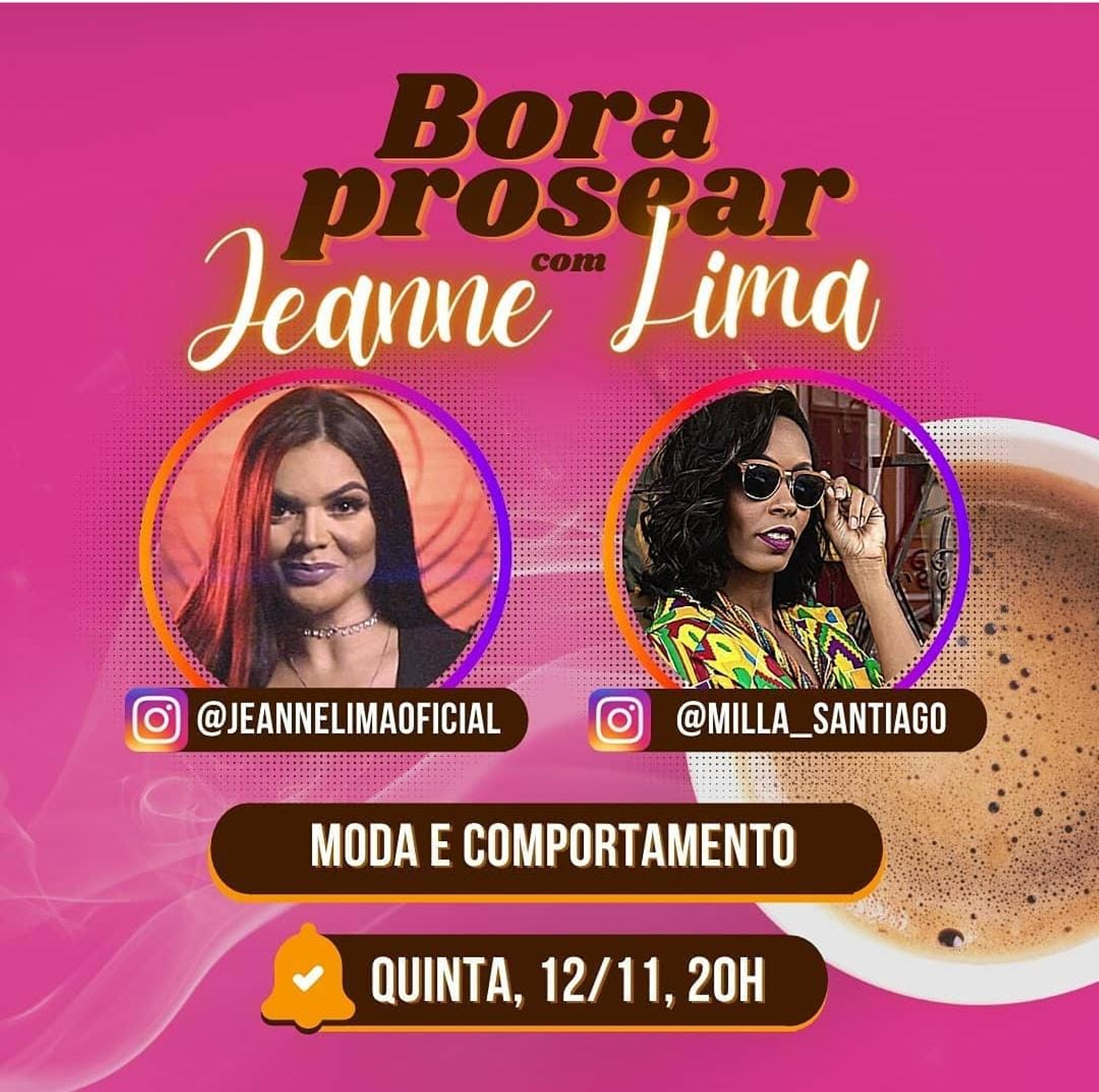 Duas mulheres cheias de estilo vão conversar sobre moda nesta quinta-feira, 12 de novembro, às 20 horas. A cantora Jeanne Lima convidou para o seu Bora Prosear desta semana a personal organizer e produtora de moda, Milla Santiago. O tema do bate papo será Moda e comportamento.