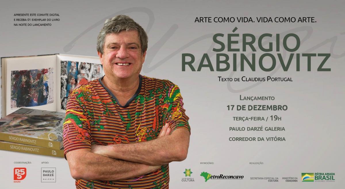 O artista plástico baiano Sérgio Rabinovitz está em contagem regressiva para o lançamento da sua biografia. Com 240 páginas, o livro sai pela P55 Edição e traz 150 obras do artista, além de textos assinados pelo poeta e crítico de arte Claudius Portugal, que narra a história de vida e arte de Rabinovitz. O lançamento acontece no dia 17 de dezembro, às 19h, na Paulo Darzé Galeria de Arte.