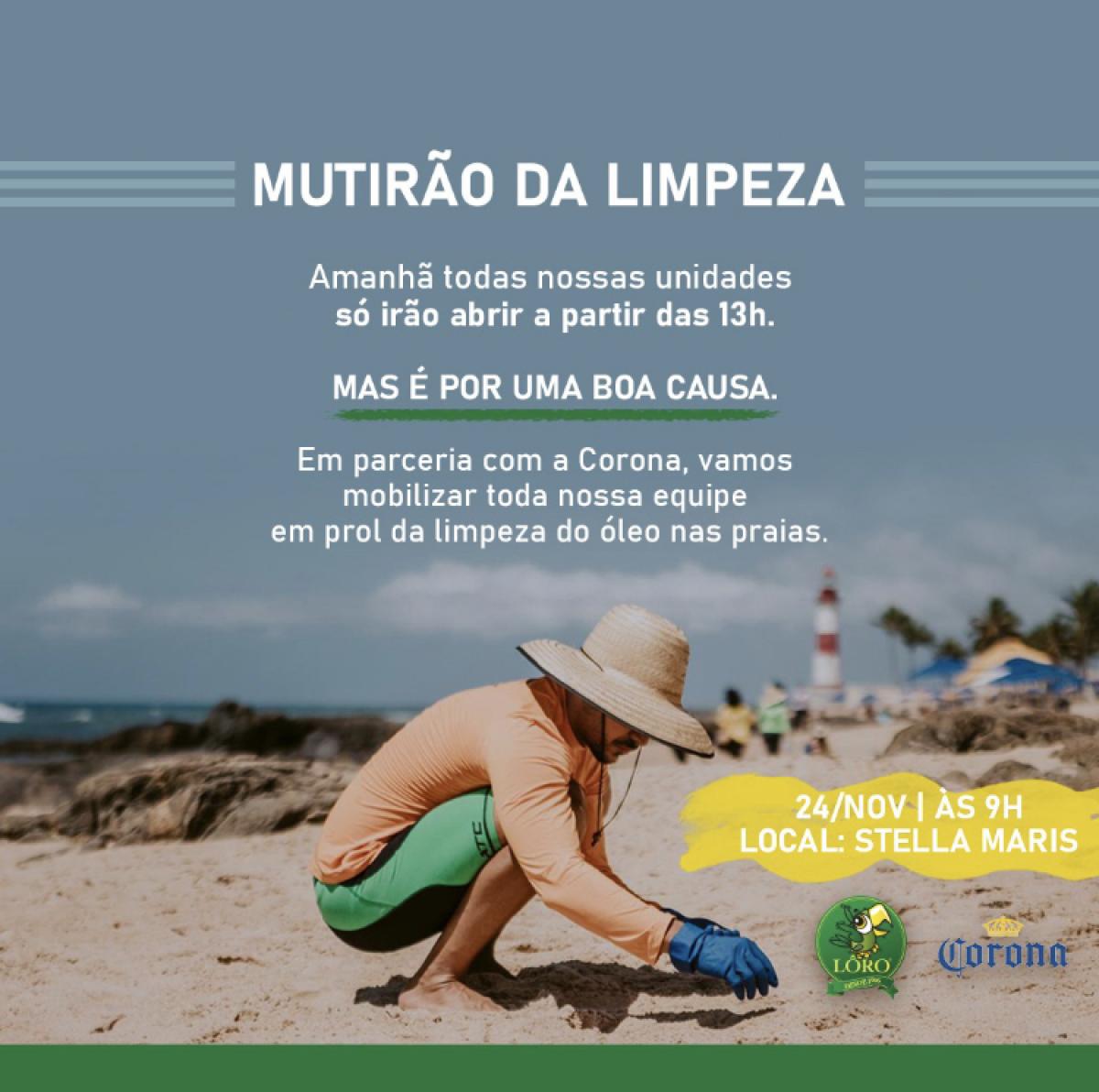 O Lôro vai parar suas atividades na manhã dessa quinta-feira, 24 de outubro, para fazer uma operação "pente fino" nas praias atingidas pelo derramamento de óleo. Desde o primeiro dia do trágico acidente ambiental que atingiu Salvador, os restaurantes da marca Lôro vem apoiando os órgãos envolvidos na redução do dano e toda equipe de voluntários que está indo às praias coletar o material. Por decisão geral, excepcionalmente na próxima quinta-feira, dia 24/10, as atividades serão interrompidas durante a manhã e todos os colaboradores estarão empenhados na limpeza das praias, em uma operação de pente fino, tentando retirar as pequenas partículas de petróleo que ainda estão na areia e nas pedras. A ação acontecerá no mesmo dia em que a cerveja Corona, parceira do Lôro, mobilizou seu time para limpar as praias do nordeste. O desejo do Lôro, que sempre promoveu ações de sustentabilidade, é dar o máximo possível para reduzir os danos ambientais desse desastre, buscando manter as praias limpas, com balneabilidade, aptas para a prática de atividades esportivas e de lazer dos baianos e turistas que as frequentam.